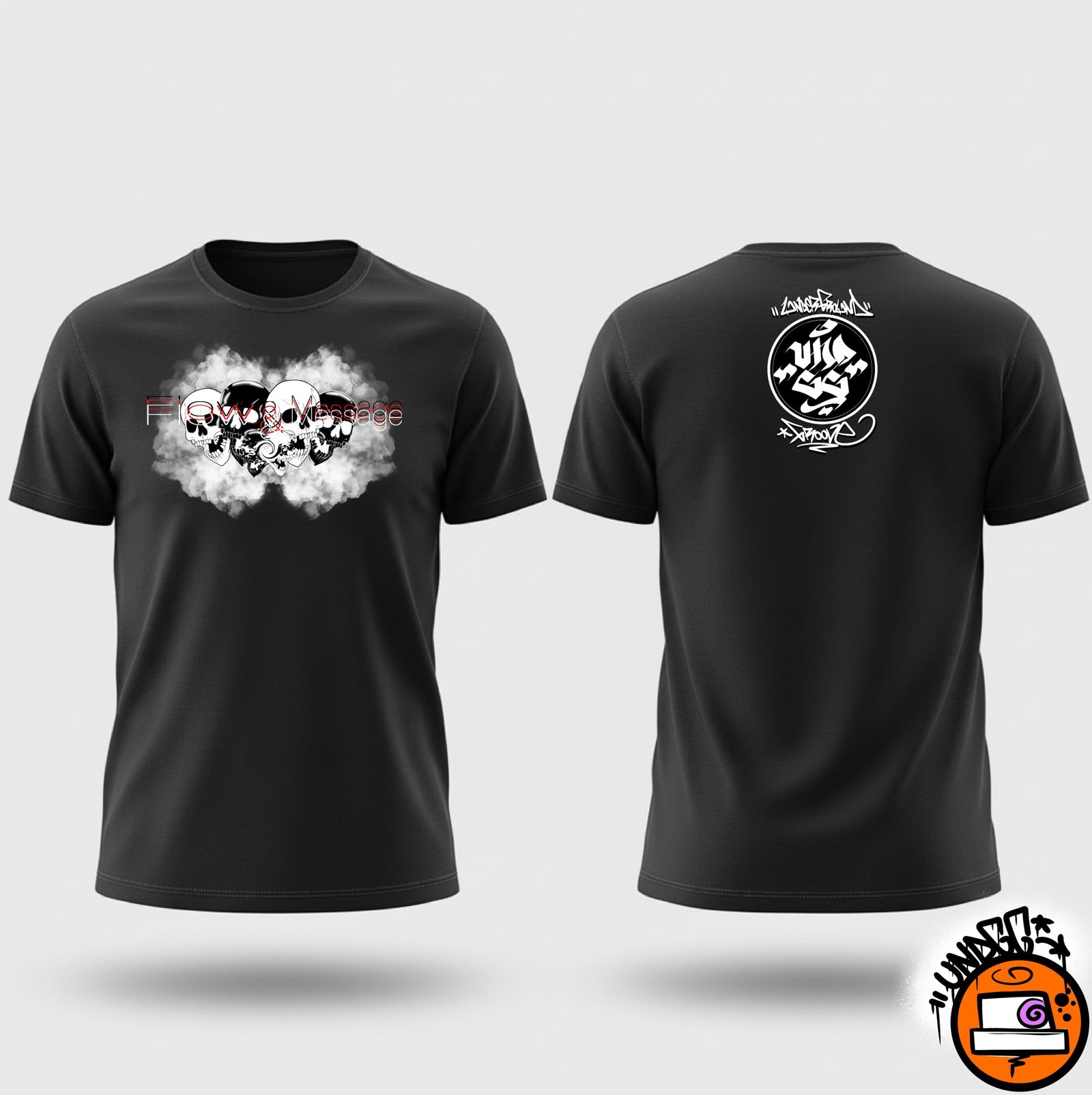 Camiseta negra con diferentes calaveras blancas y negras, representación ying yang flow & message.